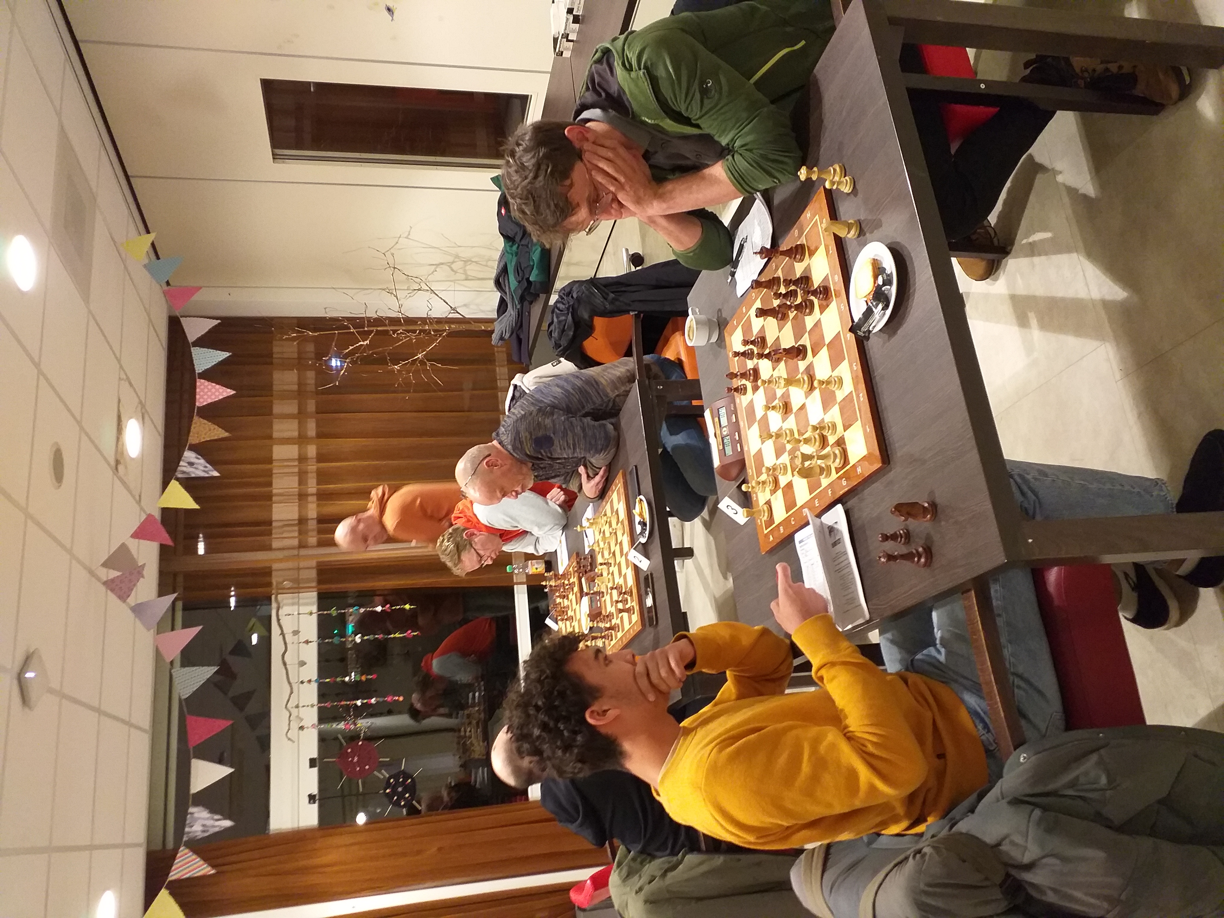 Gelukkig waren we op tijd. Het toernooi zat als volgt in elkaar: per partij krijg je 3 minuten en 2 seconden. Eerst spelen we 3 voorrondes van 3 partijen, dus 9 in totaal. Daarna pauze en dan de finale ronde. In die finale ronde groepen van 8 (of 7) man die 2x tegen elkaar spelen. Wij speelden in totaal 21 partijen omdat we met 7 man in de finale groepen zaten.